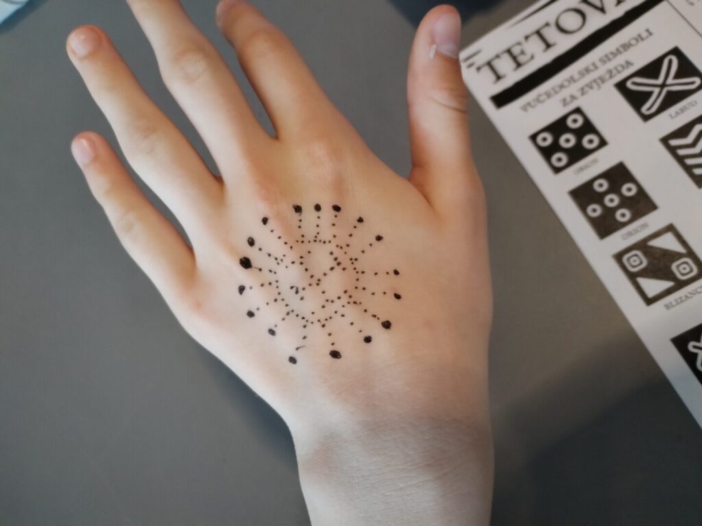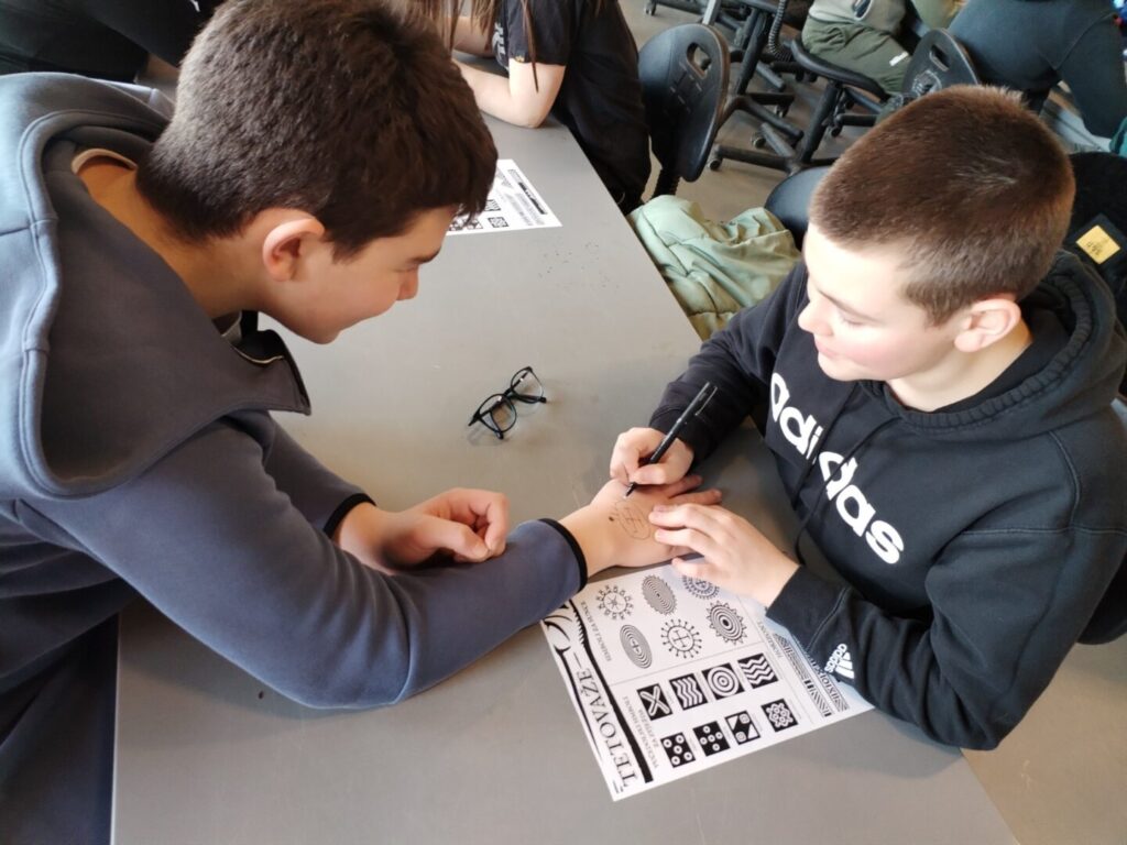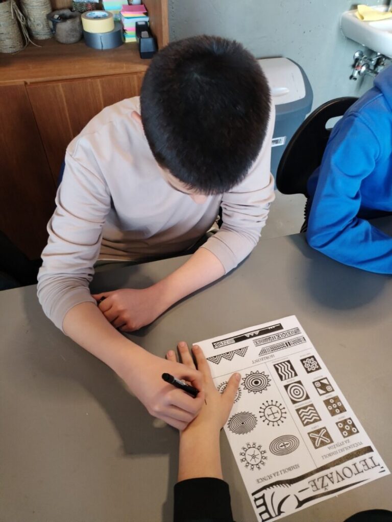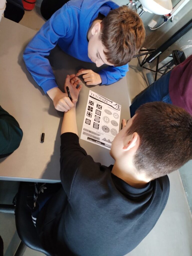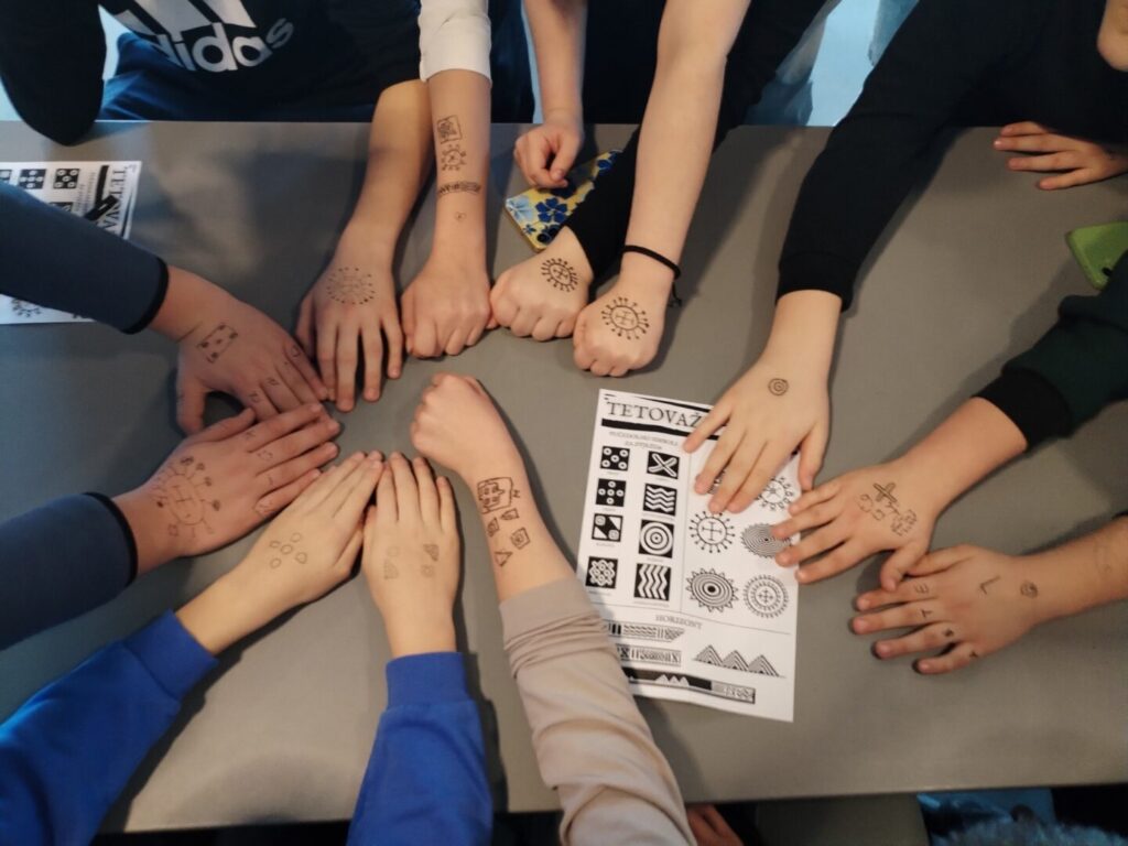 Nakon obilaska učenici su imali priliku sudjelovati u radionici koju je također vodio muzejski pedagog. U prvom dijelu radionice učenici su saznali kako pripadnici vučedolske kulture nisu koristili nakit. Urezani križevi na nadlakticama i bedrima ženskih keramičkih figurica sugeriraju da su oni bili tetovirani. Najvažniji element u tetovažama bili su solarni motivi i križevi. Učenici su pomoću paus papira s različitim motivima tetovaža jedni drugima izrađivali tetovaže. Neke od uradaka možete i vidjeti na fotografijama.