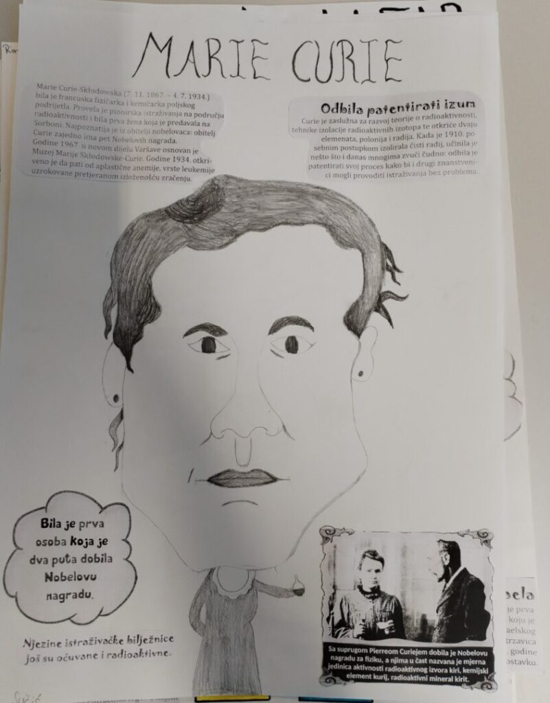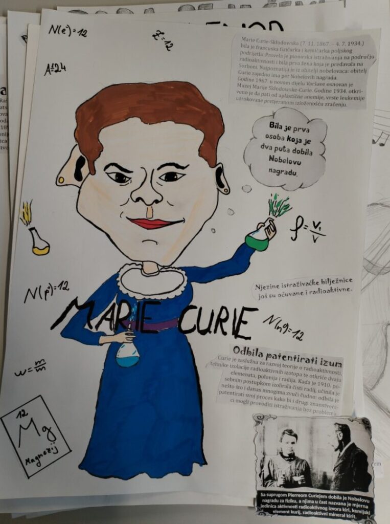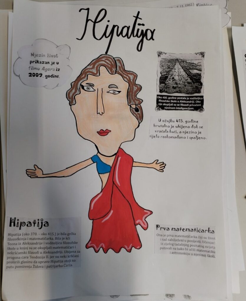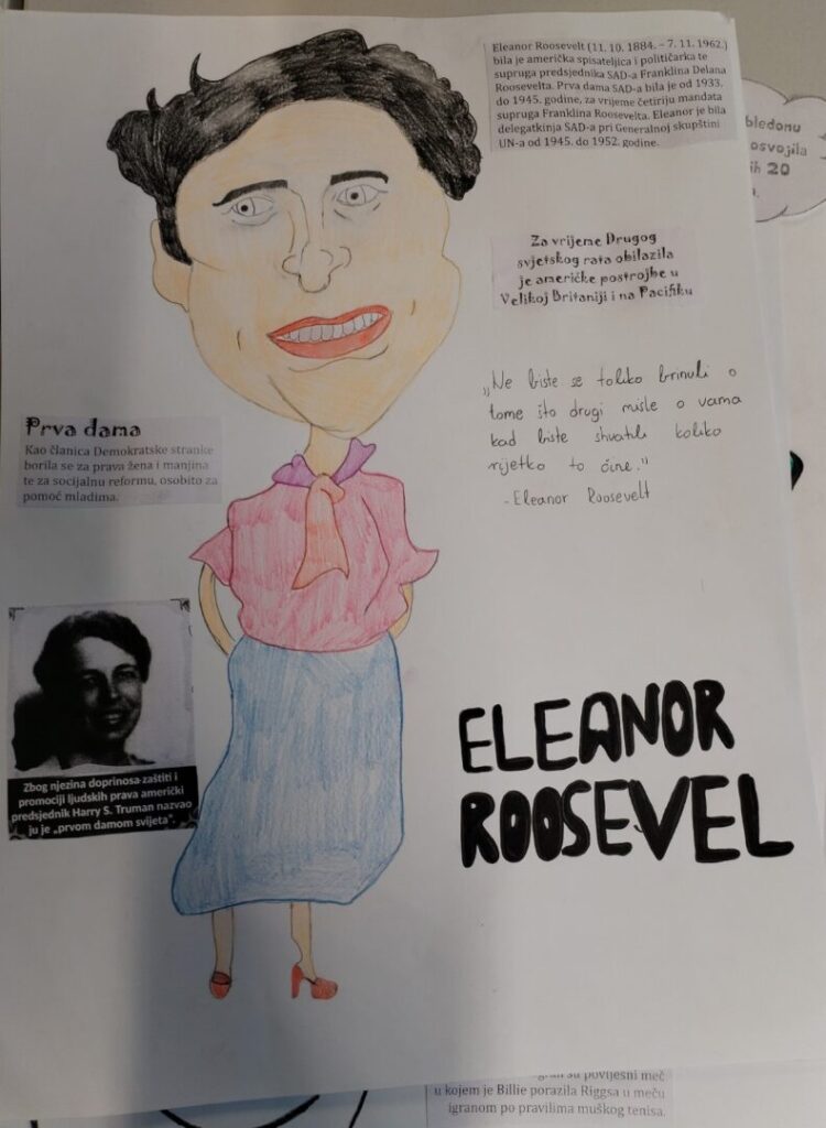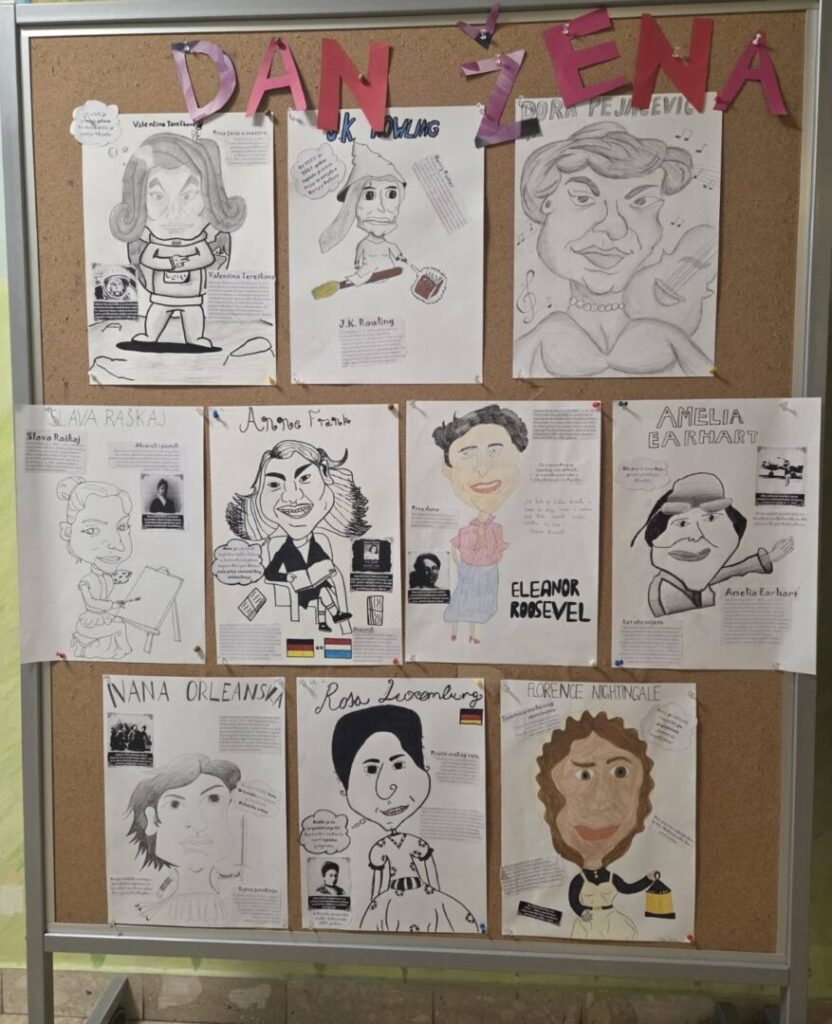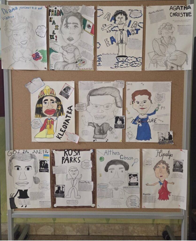 Na satu likovne kulture učenici su  istraživali što je karikatura. Najprije su ponovili proporcije ljudskog tijela na umjetničkim djelima različitih povijesnih razdoblja te omjer veličine glave u odnosu na ukupnu visinu čovjeka. Omjeri veličina na licu mogu se i namjerno promijeniti. Prikaz lica s namjerno preuveličanim odnosima veličina naziva se karikatura. Pri oblikovanju karikature učenici su pazili na prikaz karakterističnih obilježja neke osobe, odnosno na njihovo preuveličavanje, umanjivanje ili iskrivljavanje. Karikaturu su uklopili u formu plakata, zajedno s ključnim informacijama vezanima uz određenu ženu. Rezultate njihovog rada možete vidjeti na fotografijama.