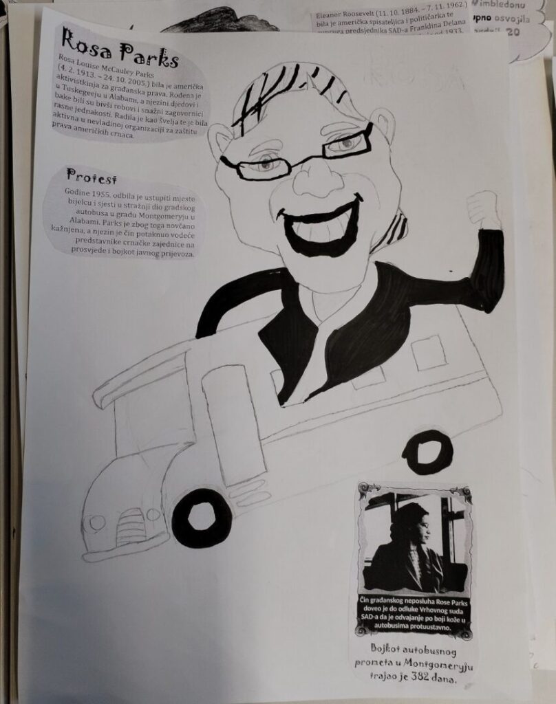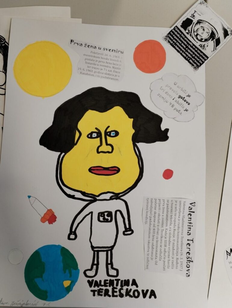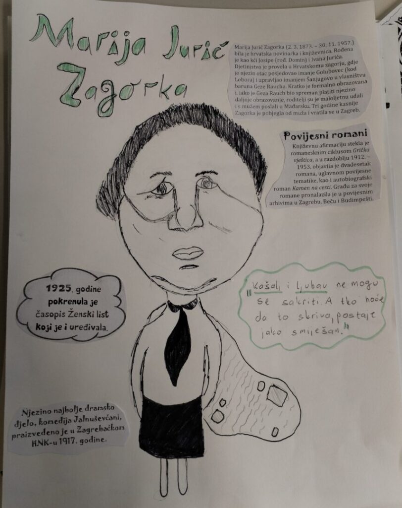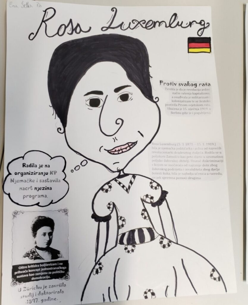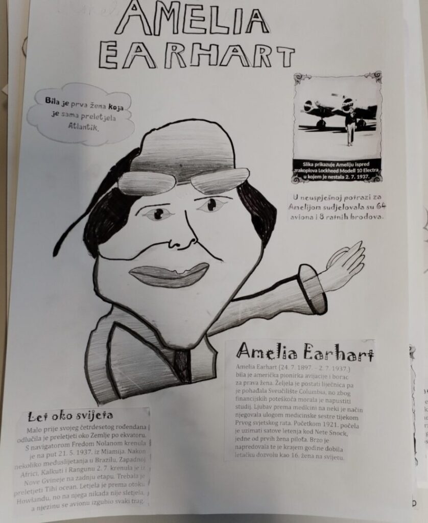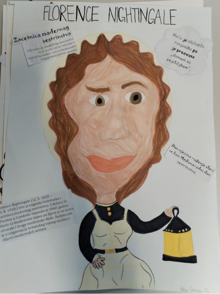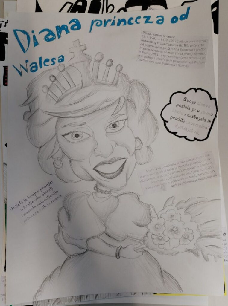 Na satu likovne kulture učenici su  istraživali što je karikatura. Najprije su ponovili proporcije ljudskog tijela na umjetničkim djelima različitih povijesnih razdoblja te omjer veličine glave u odnosu na ukupnu visinu čovjeka. Omjeri veličina na licu mogu se i namjerno promijeniti. Prikaz lica s namjerno preuveličanim odnosima veličina naziva se karikatura. Pri oblikovanju karikature učenici su pazili na prikaz karakterističnih obilježja neke osobe, odnosno na njihovo preuveličavanje, umanjivanje ili iskrivljavanje. Karikaturu su uklopili u formu plakata, zajedno s ključnim informacijama vezanima uz određenu ženu. Rezultate njihovog rada možete vidjeti na fotografijama.