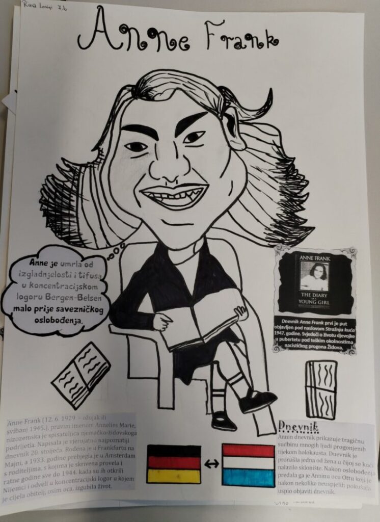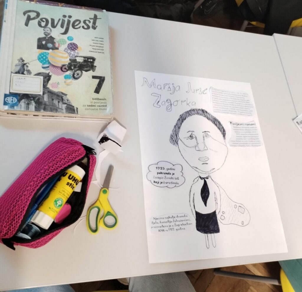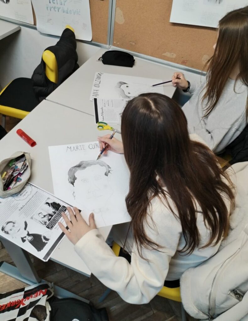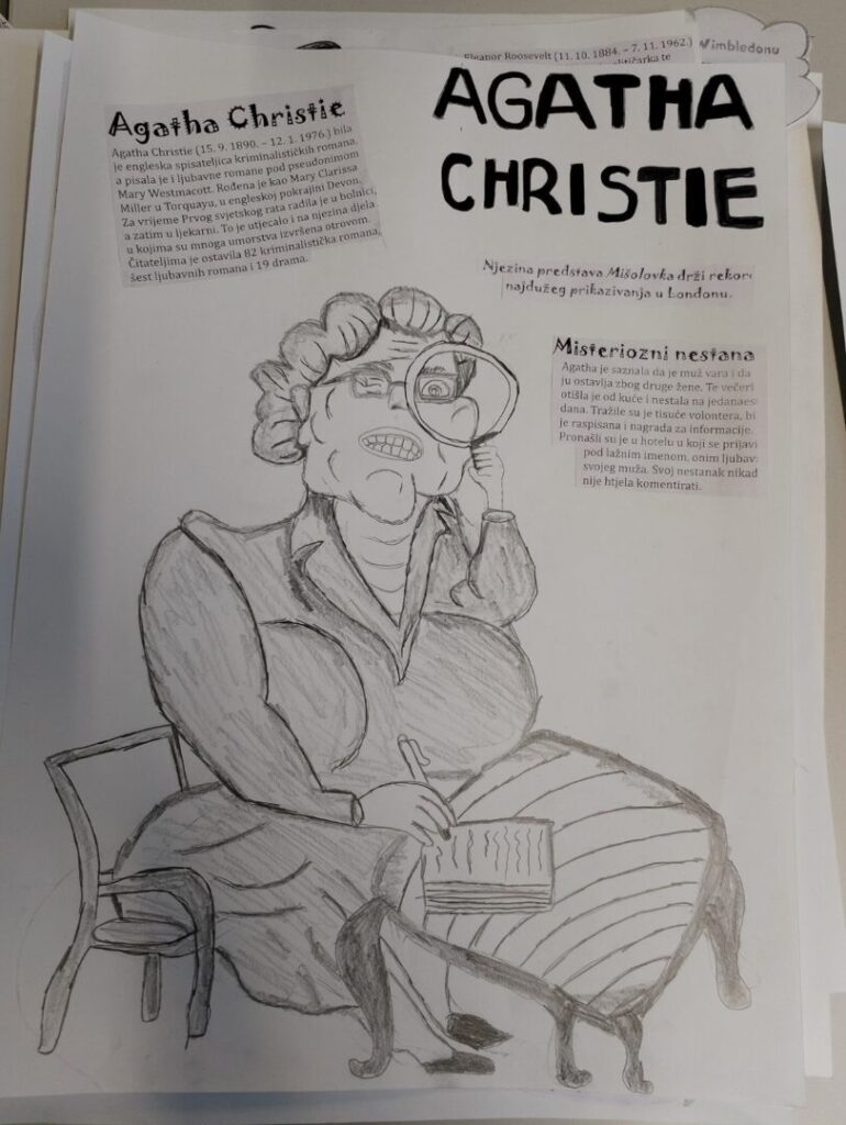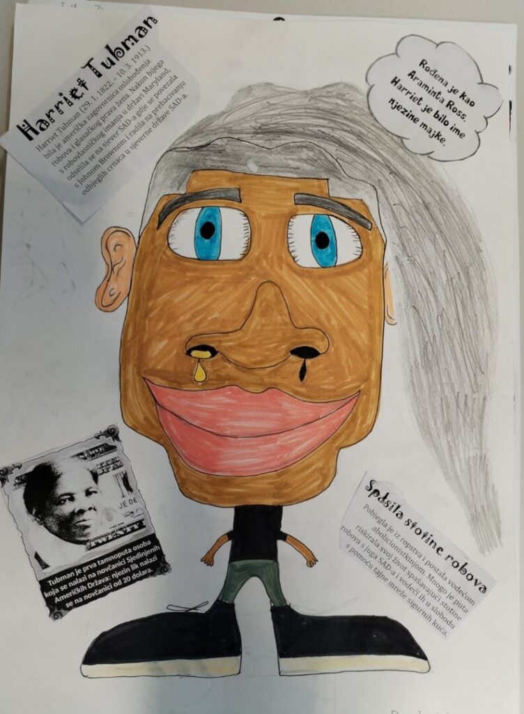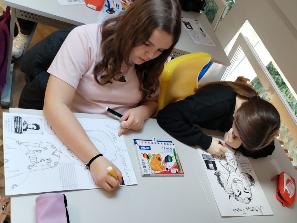Na satu likovne kulture učenici su  istraživali što je karikatura. Najprije su ponovili proporcije ljudskog tijela na umjetničkim djelima različitih povijesnih razdoblja te omjer veličine glave u odnosu na ukupnu visinu čovjeka. Omjeri veličina na licu mogu se i namjerno promijeniti. Prikaz lica s namjerno preuveličanim odnosima veličina naziva se karikatura. Pri oblikovanju karikature učenici su pazili na prikaz karakterističnih obilježja neke osobe, odnosno na njihovo preuveličavanje, umanjivanje ili iskrivljavanje. Karikaturu su uklopili u formu plakata, zajedno s ključnim informacijama vezanima uz određenu ženu. Rezultate njihovog rada možete vidjeti na fotografijama.