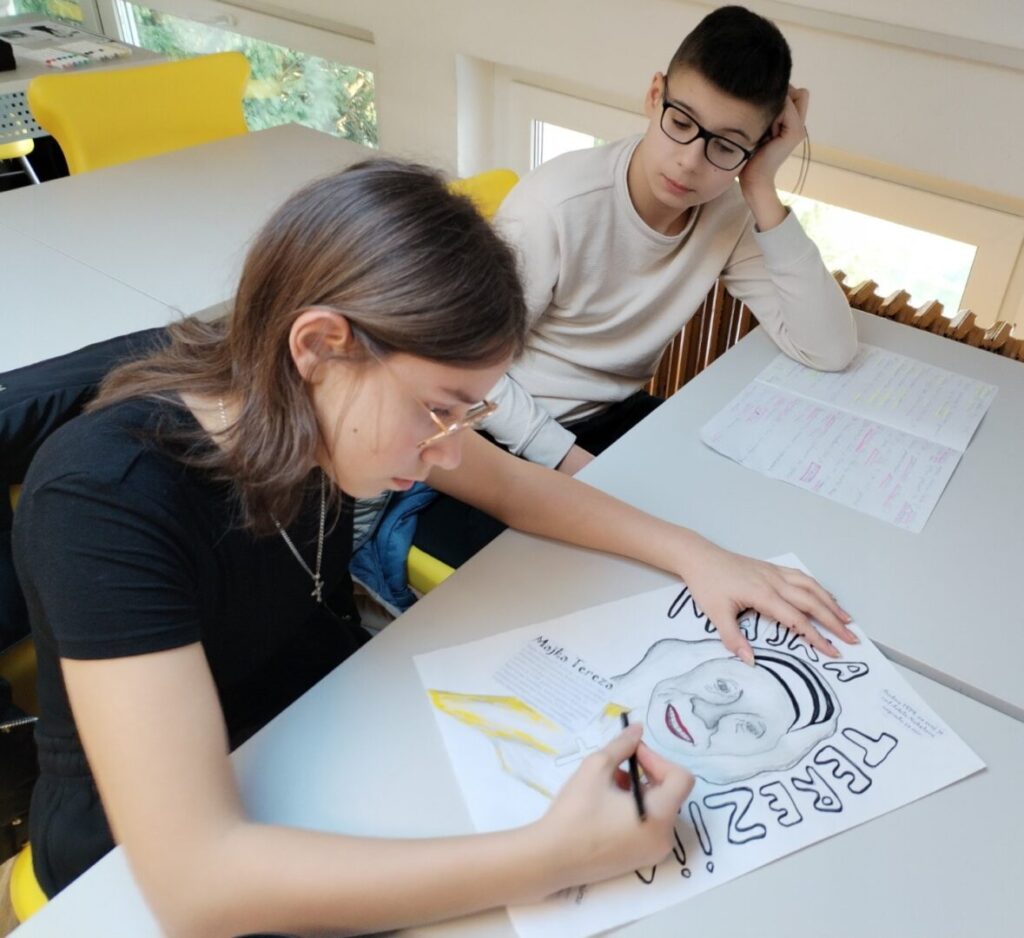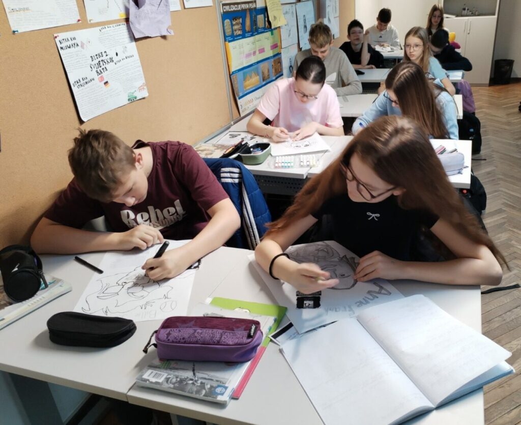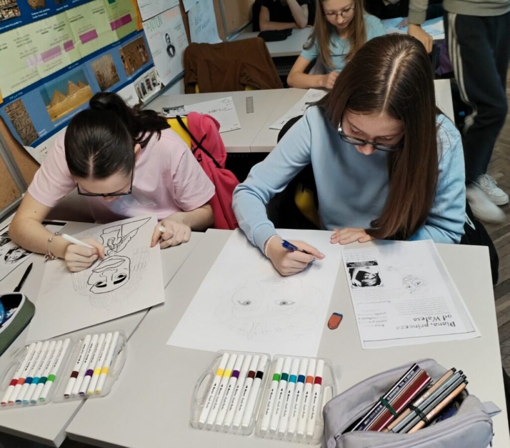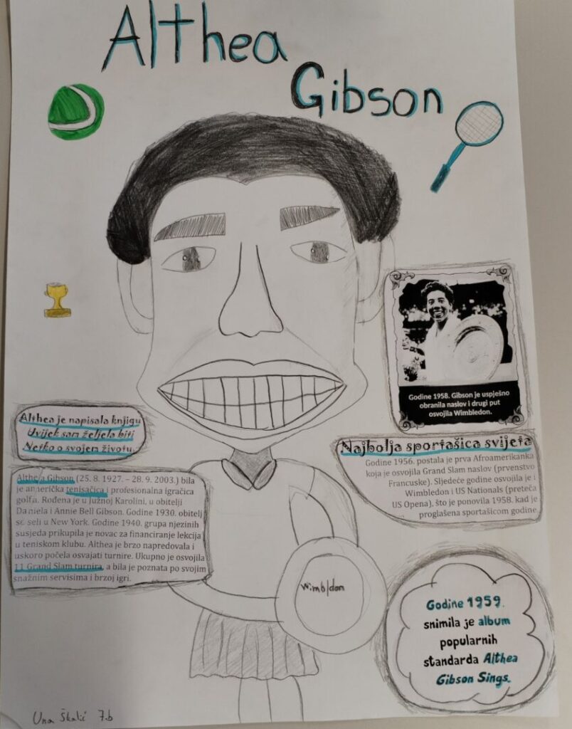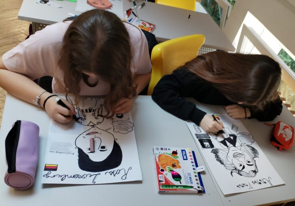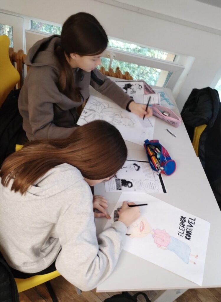 Na satu likovne kulture učenici su  istraživali što je karikatura. Najprije su ponovili proporcije ljudskog tijela na umjetničkim djelima različitih povijesnih razdoblja te omjer veličine glave u odnosu na ukupnu visinu čovjeka. Omjeri veličina na licu mogu se i namjerno promijeniti. Prikaz lica s namjerno preuveličanim odnosima veličina naziva se karikatura. Pri oblikovanju karikature učenici su pazili na prikaz karakterističnih obilježja neke osobe, odnosno na njihovo preuveličavanje, umanjivanje ili iskrivljavanje. Karikaturu su uklopili u formu plakata, zajedno s ključnim informacijama vezanima uz određenu ženu. Rezultate njihovog rada možete vidjeti na fotografijama.